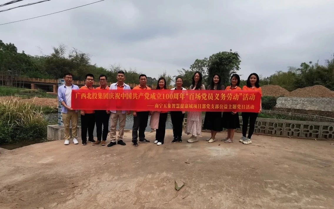 3月17日,南寧五象智慧健康城項目部組織全體黨員干部、共青團員等到那馬鎮八尺江上開展清道夫環保公益活動,實實在在地為地球環境、為五象家園獻上一份力量。
