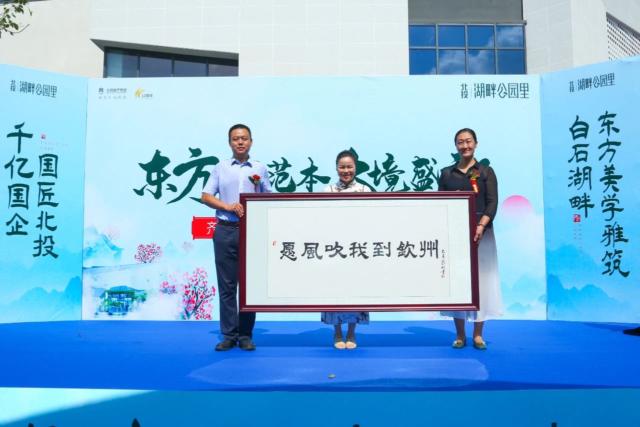 ▲在北投·湖畔公園里美學(xué)示范區(qū)開放盛典上,齊白石曾孫女中央美術(shù)學(xué)院博士、齊白石藝術(shù)中心主任齊駙向北投地產(chǎn)集團(tuán)黨委書記、董事長左皓贈予書畫作品及簽名書籍。